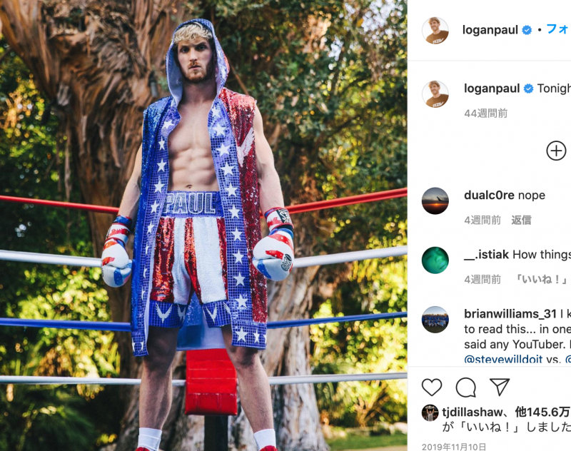 メイウェザーとのエキシビションマッチが報じられている世界的人気ユーチューバーのローガン・ポール(※自身のインスタグラムより)