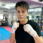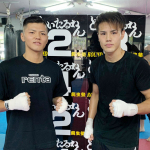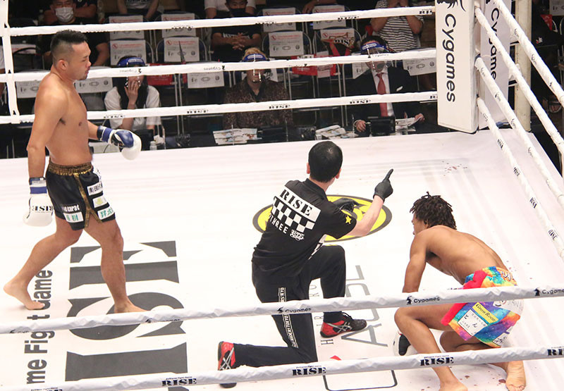 右フックでベイノア(右)からダウンを奪った緑川