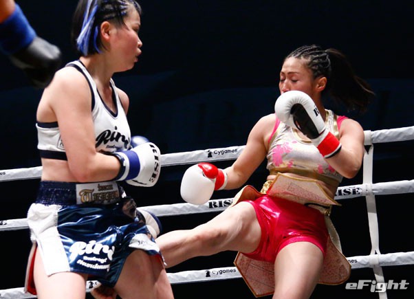 那須川天心の妹・梨々に強烈ローキックを蹴りこむ百花=18年11月