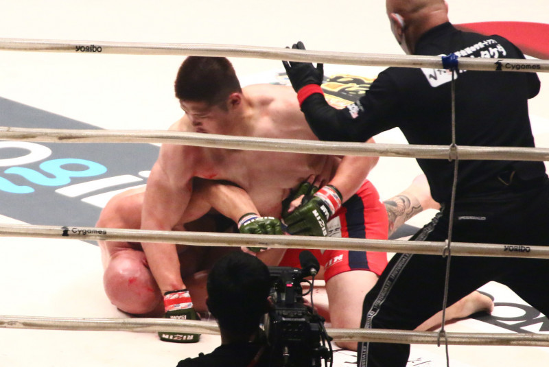出血のジェイムスに力強いパウンドパンチを見舞うスダリオ