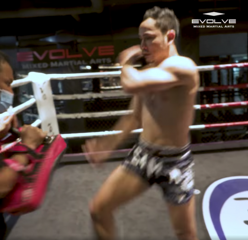 “速すぎる”芸術的ミドルキックを連打するサムエー(※Evolve MMA Facebookより)