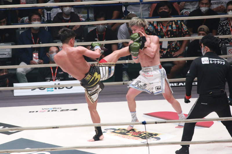 皇治は、パンチでの打ち合いに持ち込めず、蹴りを出す
