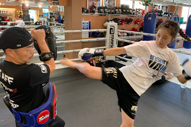 所属ジムの那須川会長の持つミットへキックを繰り出す寺山日葵