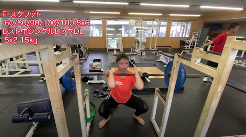 100kgのバーベルでスクワットをこなす植草歩