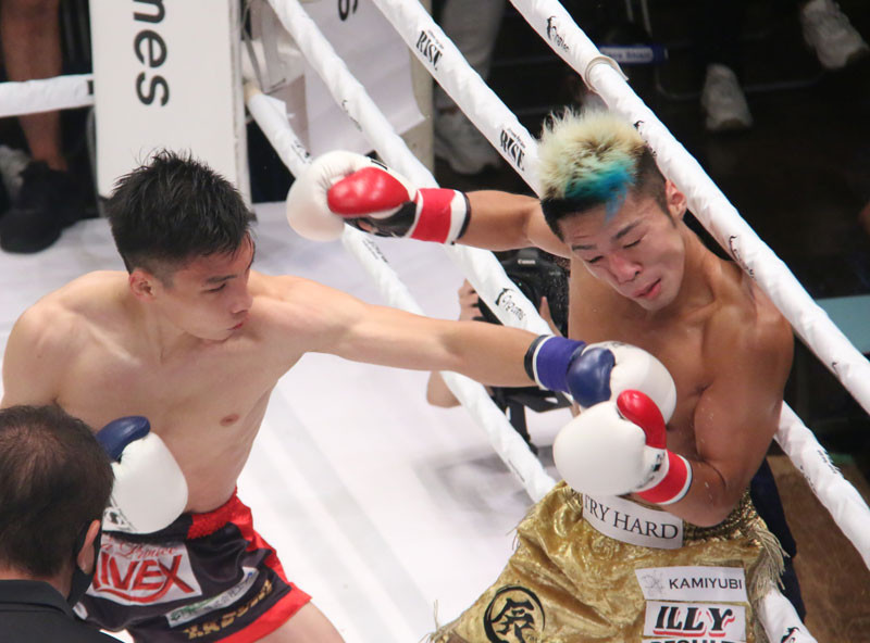 強烈なパンチで前王者・田丸の顔をねじ曲げる大﨑