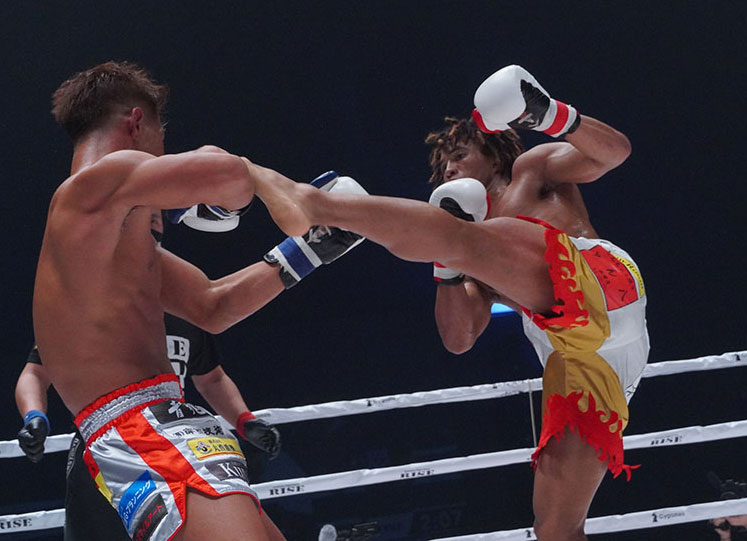 タフな宮城をハイキックでダウンさせたベイノア(右)