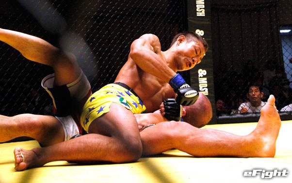 袈裟固めから腕を極めにかかるアフリカ=18年3月の修斗