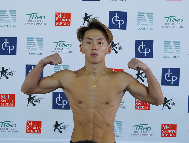 ばきばきに仕上がった腹筋を見せ、計量をパスした橋本