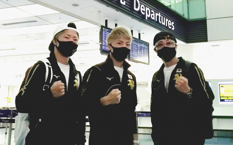 空港から出発する井上尚弥(中央)弟の拓真(左)、父・真吾トレーナー(右)