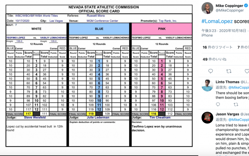 ロマチェンコとロペスのスコアカード(@MikeCoppingerより)