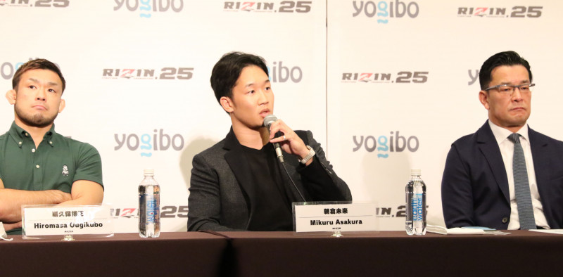 会見でコメントする朝倉未来(中央)。左は扇久保博正、右は榊原代表