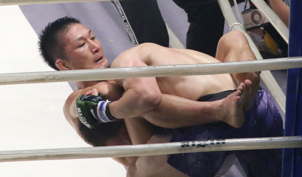 魚井をフロントチョークで攻め立てる元谷