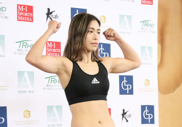 前戦(20年6月)の計量でマッスルポーズを見せる壽美。この時の体重をキープしているという