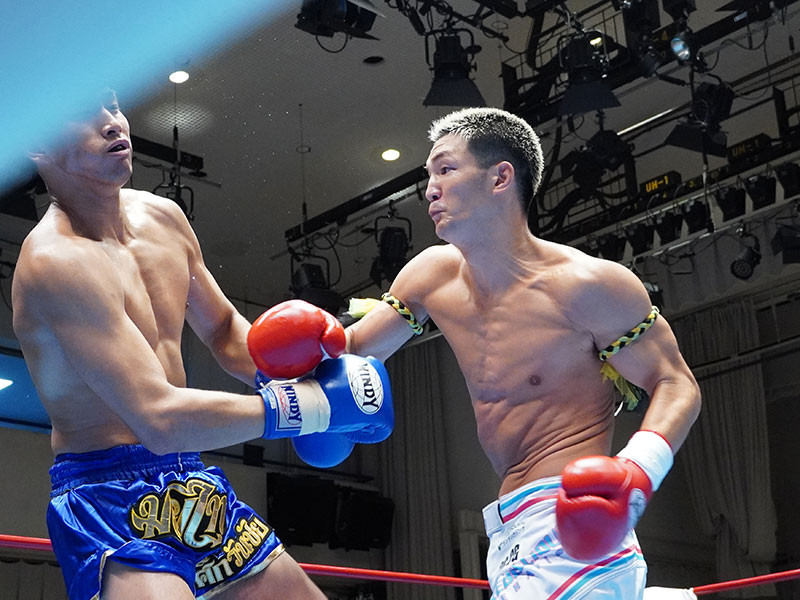 強烈なパンチを打ち込む松倉。1R TKO勝利でWPMF世界王座を戴冠した(20年9月)