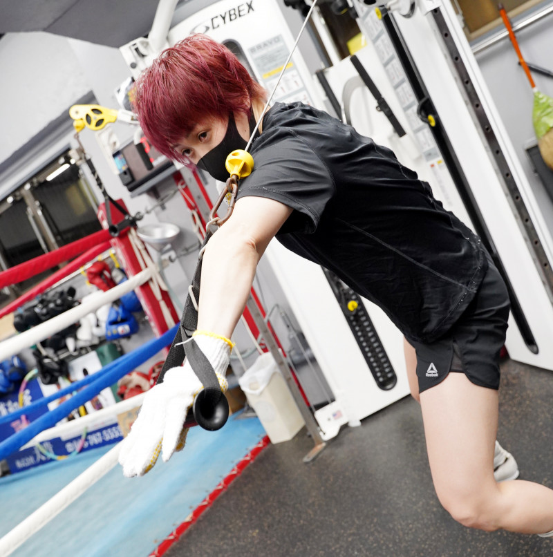 パンチ力アップのためのマシーンでトレーニングする宮尾