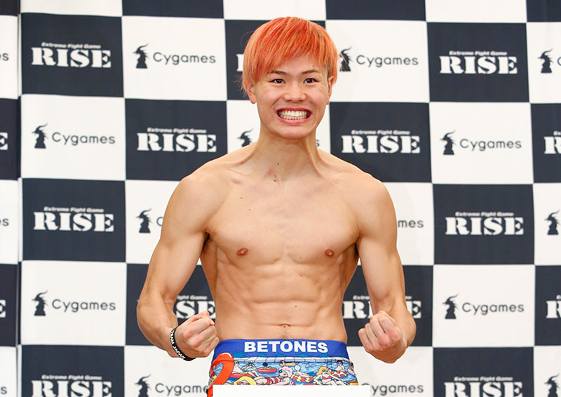 気合のマッスルポーズで計量パスする那須川(c)RISE