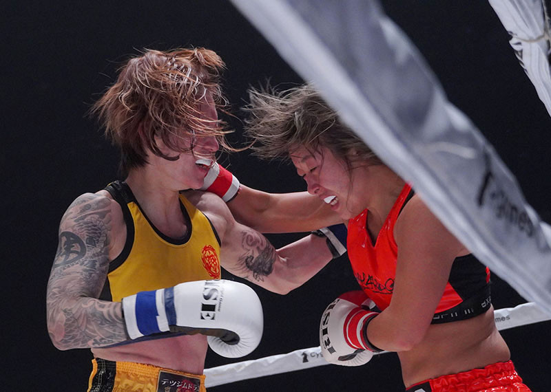ロープに詰めた後の、バチバチの打撃で会場を沸かせるsasori