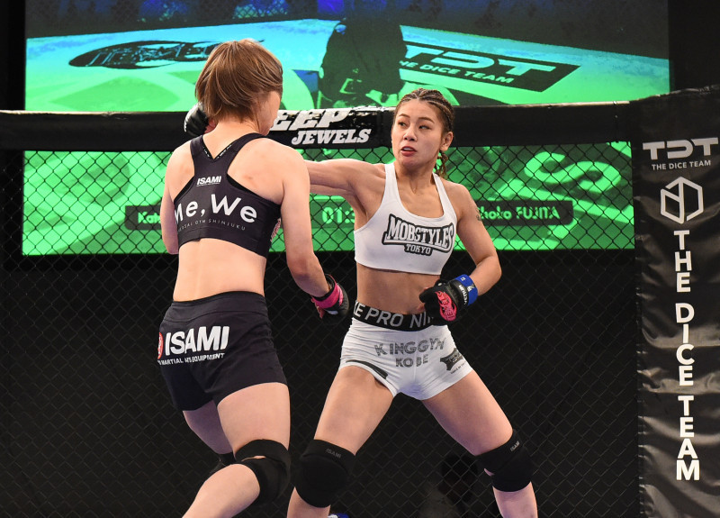強烈な打撃で藤田を攻め立てるケイト