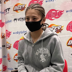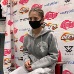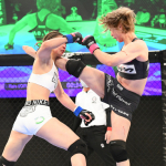 鼻から出血しながらパンチで突進するケイト・ロータス(c)DEEP