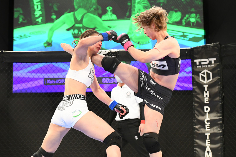 鼻から出血するケイトに藤田の極真ハイキックがクリーンヒット(c)DEEP