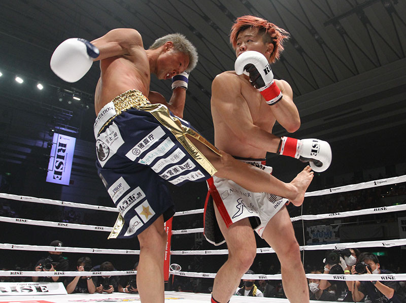 裕樹(左)得意のローキックにも万全の対策で試合に臨んだ那須川