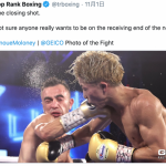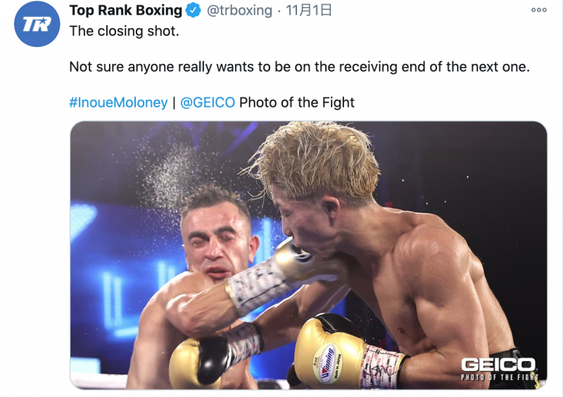 井上尚弥のKOした右ストレートがヒットした瞬間。ストレートだが肘は曲がっている。(@trboxingより)