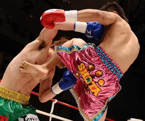12年1月のKrush-55kgタイトルマッチでも戦った瀧谷(右)と寺戸。王者・瀧谷が飛びヒザ蹴りで71秒KO勝ち、初防衛に成功した