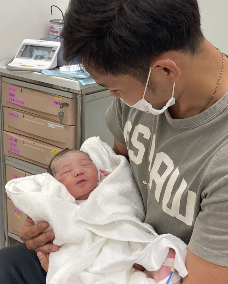 産まれたばかりの我が子を抱く日菜太(本人提供)
