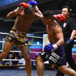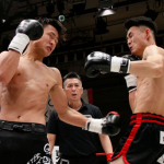 豪快なパンチをぶんぶん振り回すハルク大城(右)