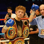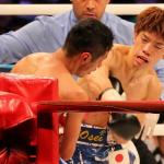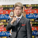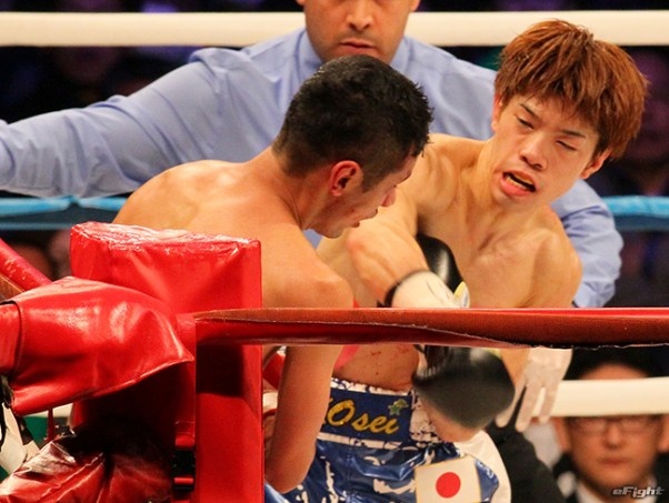 スピードのある右ストレートをヒットさせTKO勝利する田中恒成=16年フェンテス破り2階級制覇