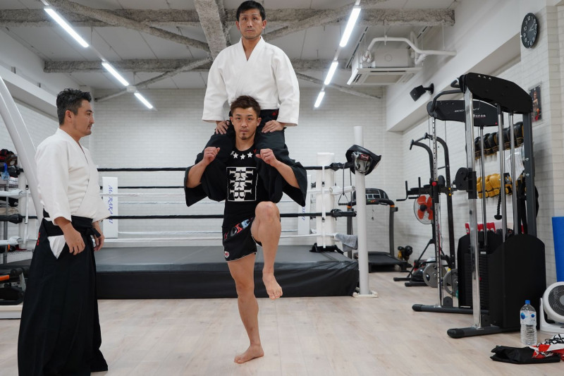 合氣の稽古で人を背負いながら片足でバランス良く立つ大和(c)K-1