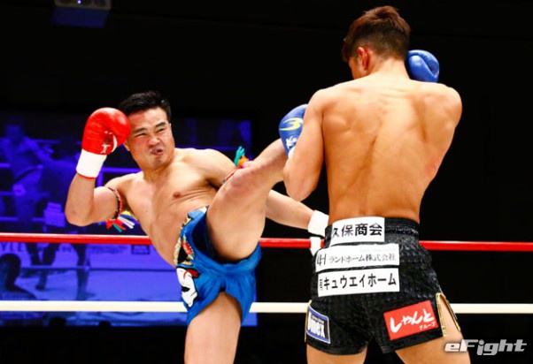 林に強烈な左ミドルを蹴り込むゴンナパー(左)=18年12月