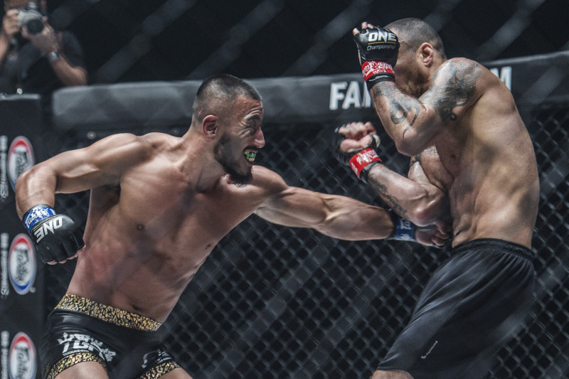 破壊力あるパンチで修斗王者ペルペトゥオを悶絶させる手塚(左)