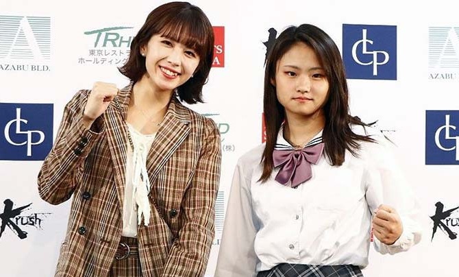 カード発表会見で菅原(左)と並ぶMOE(c)K-1