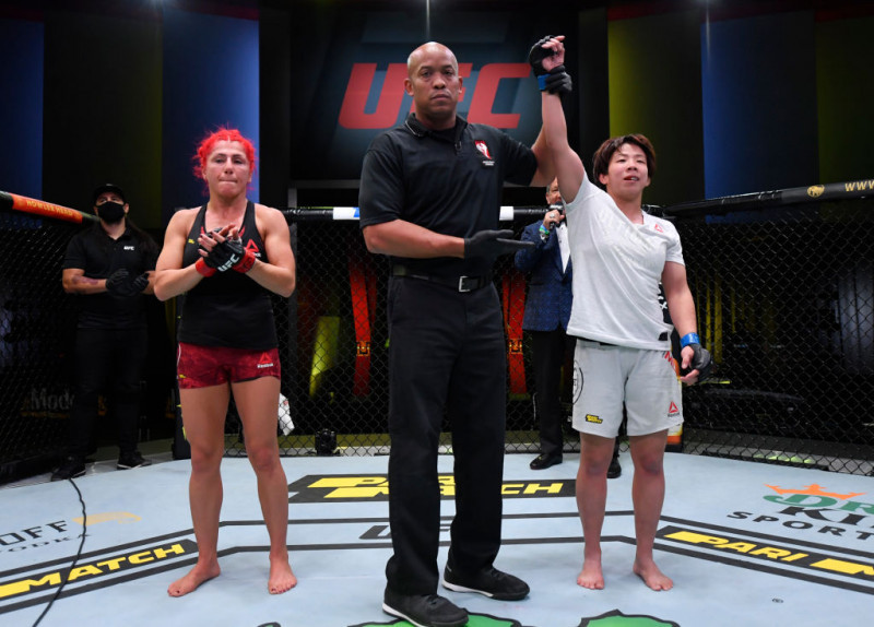 UFC初陣で勝者コールを受ける村田(getty/Zuffa LLC/UFC)