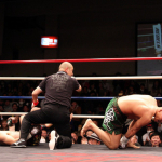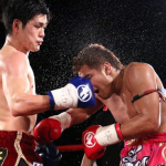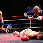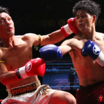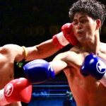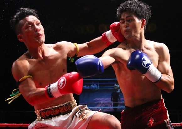水落洋祐(左)の左フックに、カウンターの右フックを合わせ、豪快KO勝ちする中村