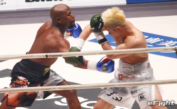 メイウェザーの長い腕のリーチが那須川を襲う(2018年大晦日)