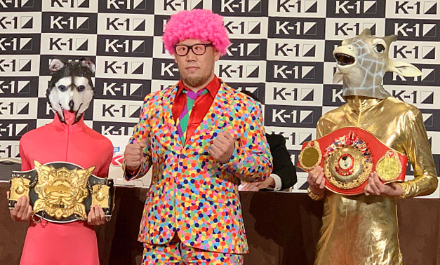 京太郎(中央)が新生K-1に参戦を決めた、ベルトを掲げて会見に出席した