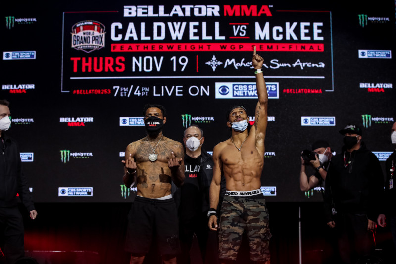 人差し指を上に突き立て“勝利ポーズ”するコールドウェル(右)対するマッキー(左)は“挑発”ポーズ
