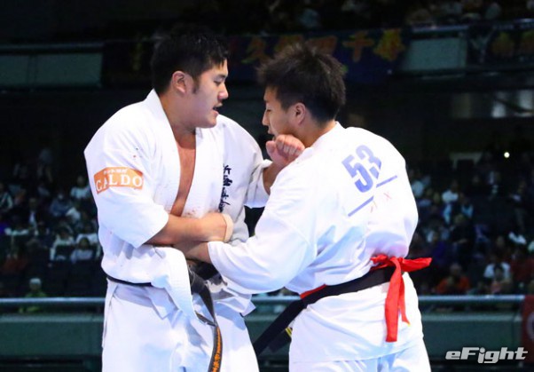 軽重量級トップの前田勝汰(右)と打ち合う江口(左)。前田は今回出場しない