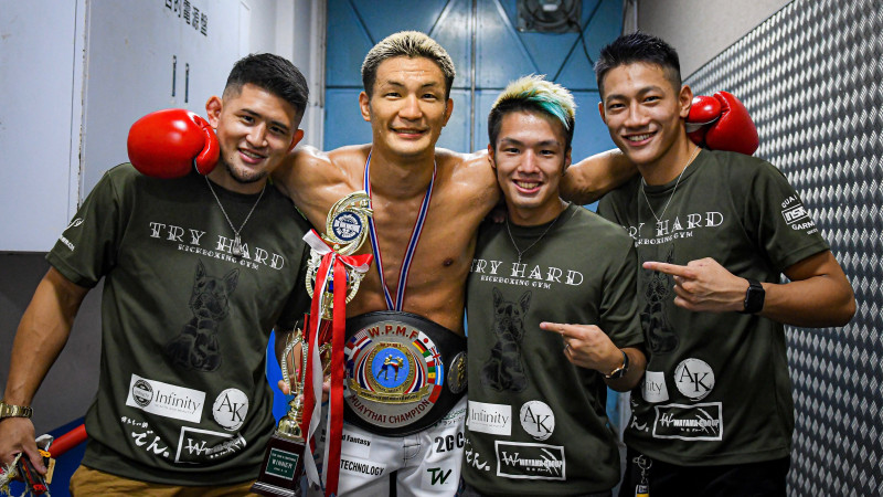 所属するTRY HARD GYMのHIROYA(左)、田丸辰(中央右)、龍聖(右)と