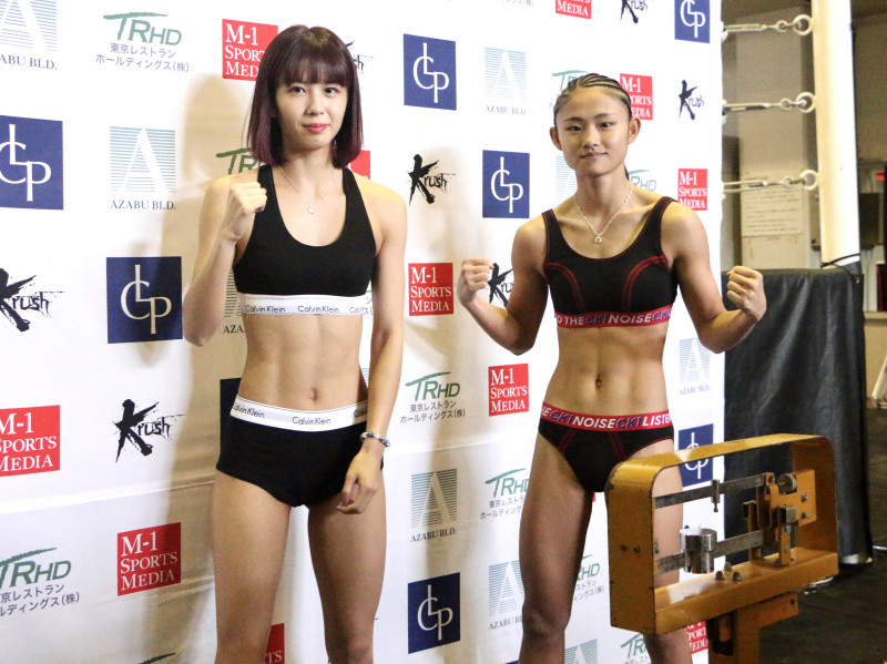 スラリと仕上げた肉体で計量に臨んだ菅原(左)とMOE(右)