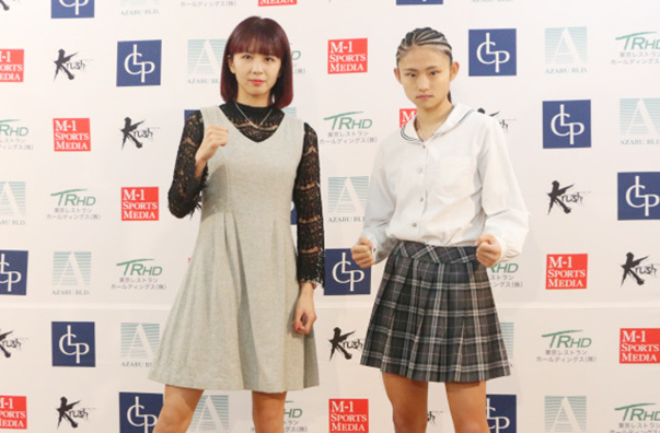 明日、王座決定トーナメント決勝で対戦する菅原美優(左)と制服姿のMOE(右)