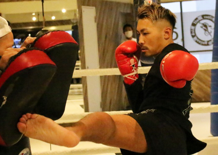 村越がミットに蹴りを放つ (C)K-1