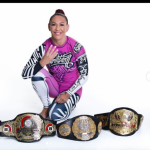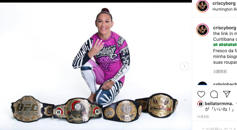 北米MMAメジャー団体の4つのベルトを前に笑顔のサイボーグ(自身のSNSより)