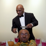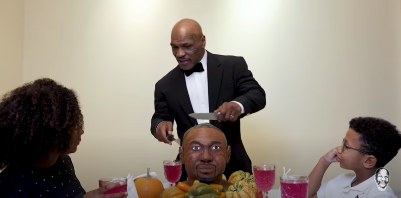 感謝祭のメインディッシュ"ロイ・ジョーンズ”にナイフを入れるタイソン(タイソンの公式YouTubeチャンネルより)