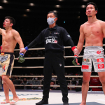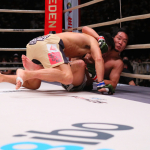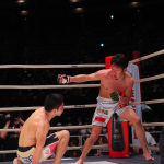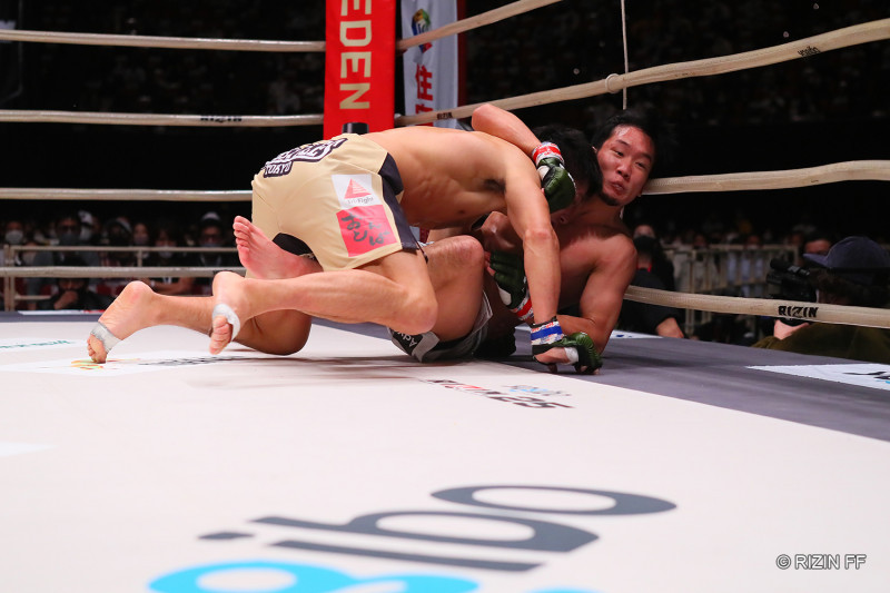 朝倉へのテイクダウンに成功した斎藤(左)
