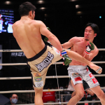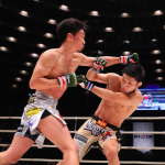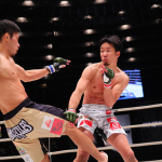斎藤の策にハマったか、テイクダウンを許す朝倉(右)