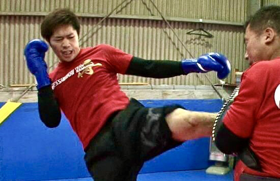 重いミドルキックを放つ和島