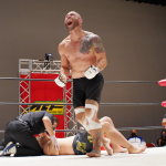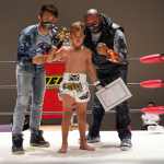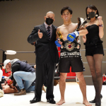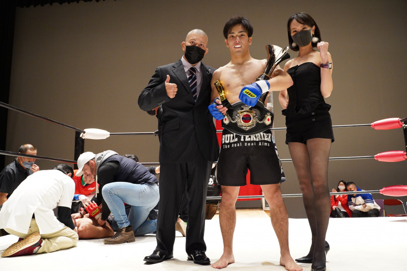 KOでタイトル奪取の田中、ラウンドガールも祝福。左が谷プロモーター。